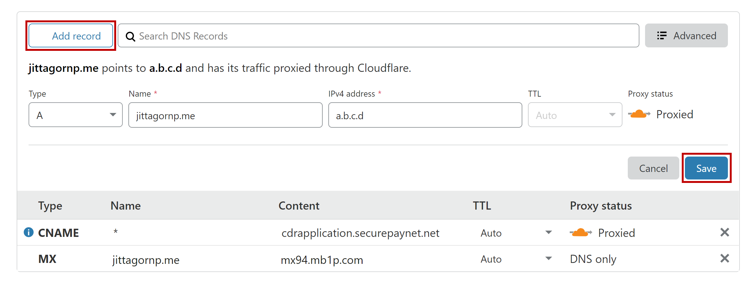 A คือ DNS Record Type Ajittagornp.me คือ Domain Name ของเราa.b.c.d คือ IP V4 เครื่อง Server ของเราสมมติเป็น a.b.c.dจากนั้นคลิก Save เพื่อบันทึกข้อมูล