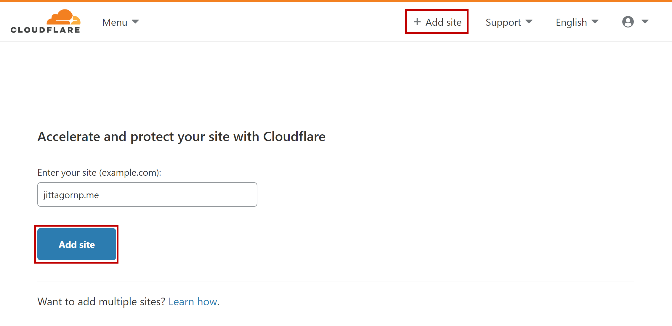 เมื่อสมัคร Cloudflare เสร็จแล้ว ต่อมาให้เรา Add Domain Name หรือ Site เราเข้า Cloudflare ดังนี้