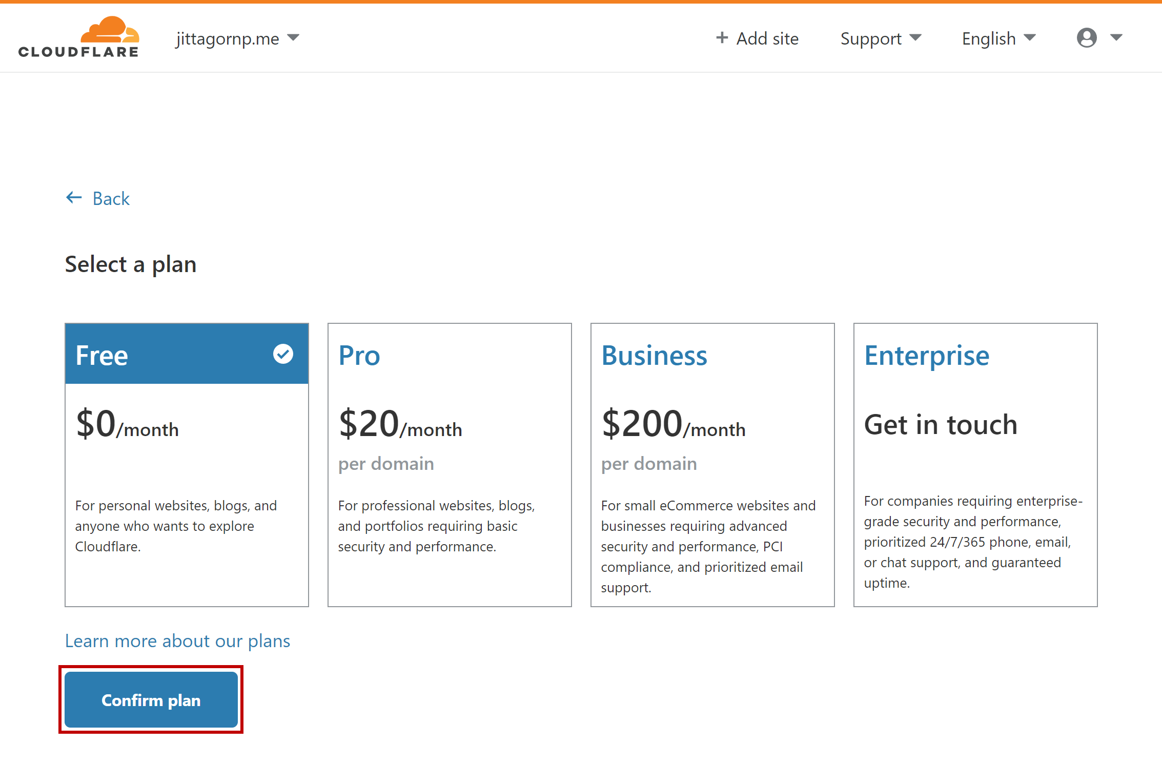 จากนั้นเลือก Plan การใช้งาน ตอนนี้เลือกเป็นแบบ Free แล้วคลิก Confirm plan