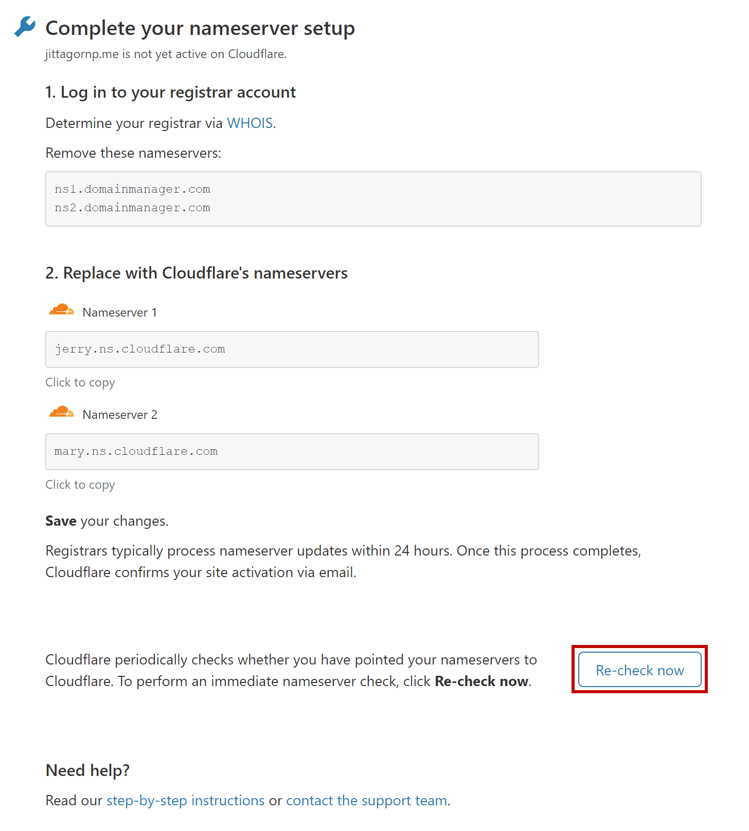ลองคลิกที่ปุ่ม Re-check now เพื่อทำการ Re-check Nameserver อีกครั้ง
