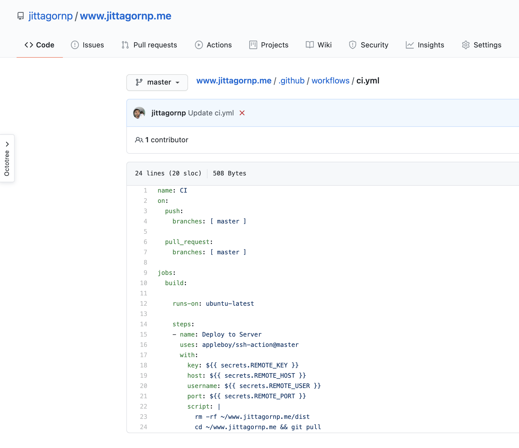 เมื่อเราทำการ Push หรือ Pull Request ไปที่ Branch master ตัว Action นี้จะทำงาน และทำการ Remote SSH เข้าไปที่เครื่อง Server เรา เพื่อ Deploy หรือทำตามคำสั่ง (Command) ที่เรากำหนดไว้
