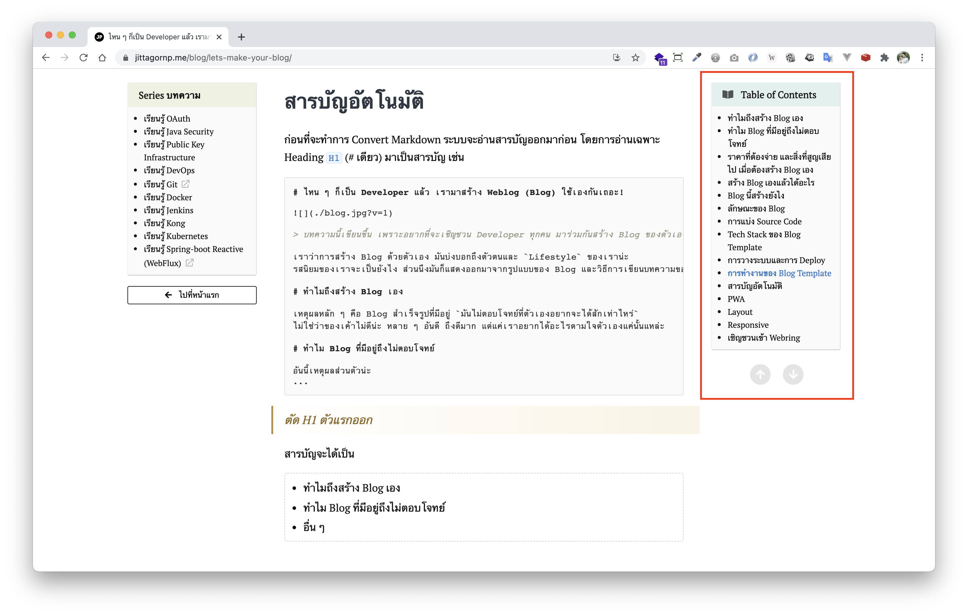 ก่อนที่จะทำการ Convert Markdown ระบบจะอ่านสารบัญออกมาก่อน โดยการอ่านเฉพาะ Heading H1 (# เดียว) มาเป็นสารบัญ เช่น